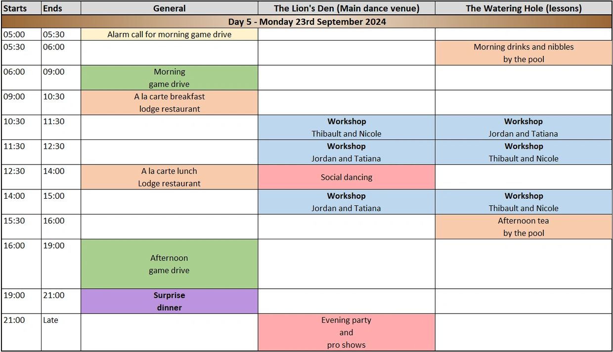 The Safari Swing schedule is absolutely packed full of fun, dancing, learning, dining, socialising and over 24 hours in the stunning African wilderness, seeking out and viewing some of natures most exciting animals. See below for our 2024 schedule to give you an idea of what you have to look forward to. Note that we are currently updating the schedule with minor changes for Safari Swing 2026. We learned a lot from the first event and we want to make the next one even better!